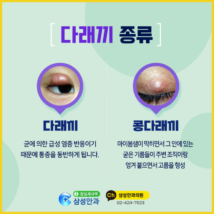 별 문제 아닌 것 같은데 안과를 꼭 가서 진료를 받아야 하는 건가 싶기도 하고, 그냥 두면 안 될 것 같은 마음이 들기도 하고 그러시죠, 저희 삼성안과의 모든 의료진은 눈다래끼 고름 짜기, 자연치유 등에 대해서 고민하시는 분들께 다래끼를 쉽게 생각하여 함부로 짜지 말아야 한다고 말씀드리고 있습니다. 왜냐하면 2차 감염이 되기 쉽고, 피부에 덕지덕지한 흉터가 생길 수 있기 때문입니다. 하여 스스로 눈다래끼 고름 짜기 방법을 찾아보는 것보다는 꼼꼼하게 상태를 살펴, 의료적 조치를 받을 수 있는 안과를 우선 찾아보셨으면 하는 바람입니다.