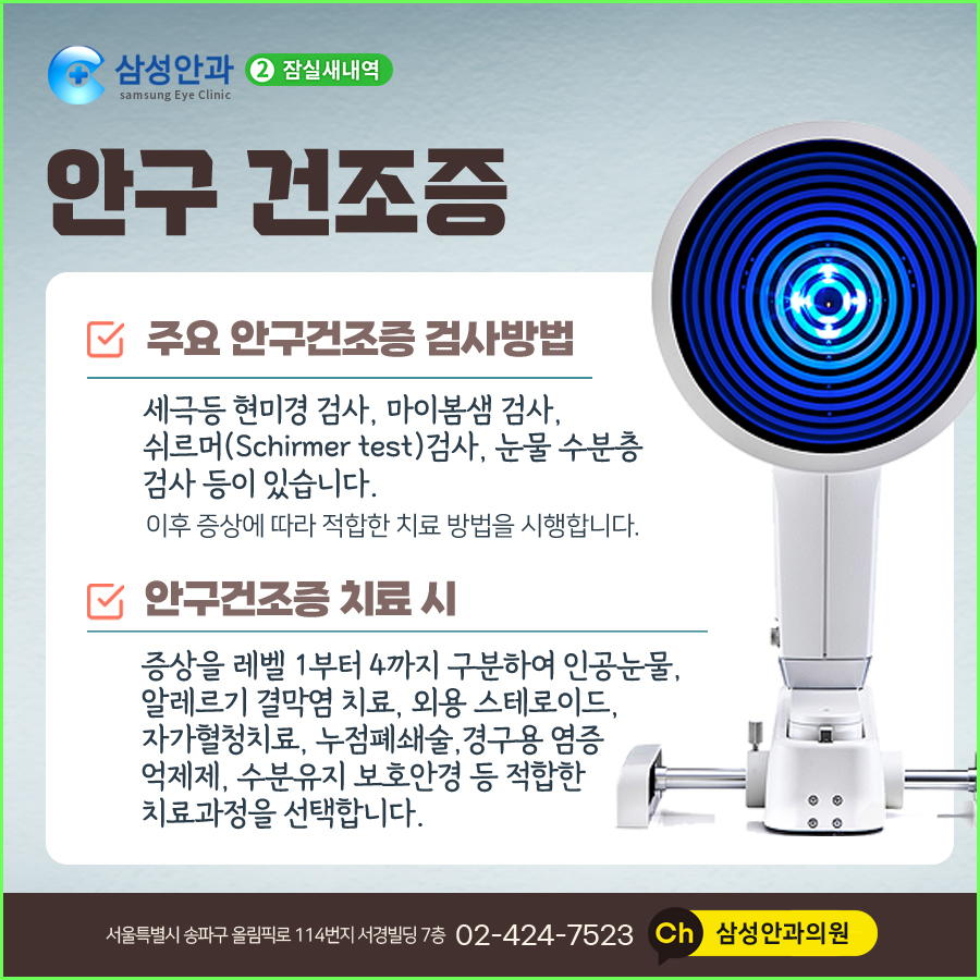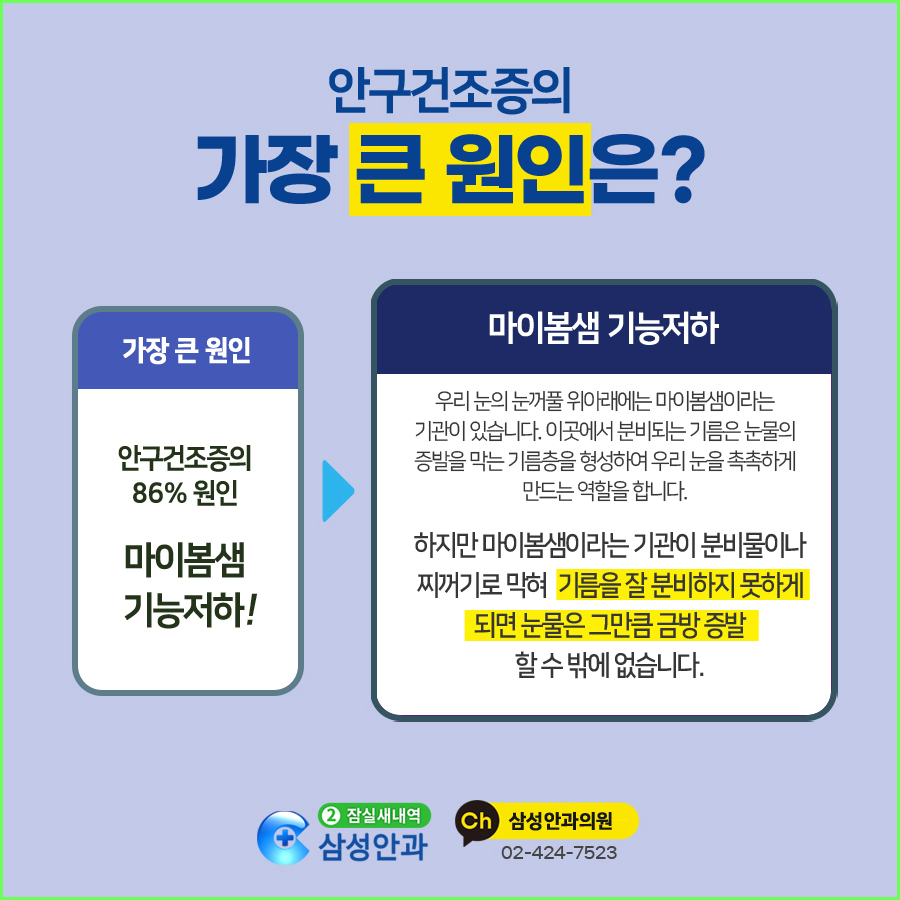 삼성안과에서는 눈꺼풀 이물감 및 눈시림, 안구건조 두통 등 눈의 피로와 건조함의 발병 원인이 어디에 있는지 알기 위해서 진단 및 여러 관련된 발전된 장비의 도움을 받을 수 있습니다. 또한, 적절한 안약 처방뿐 아니라 직접적인 원인이 되는 눈꺼풀의 마이봄샘을 치료하고 추가적인 교육을 안내해드리는 등 적극적으로 관리해드리고 있으니 인공눈물을 넣어도 호전되지 않는다면 체계적인 검사를 통해 원인을 먼저 파악해보시기 바랍니다.