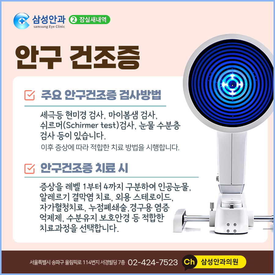 제일 좋은 것은 불편함이 느껴질 때 진료를 받고 원인에 따른 맞춤 치료를 받는 것이니 안구건조증 시력저하 더 나빠지기 전에 삼성안과에 내원하여 세밀한 진단과 치료를 받으시기 바랍니다.